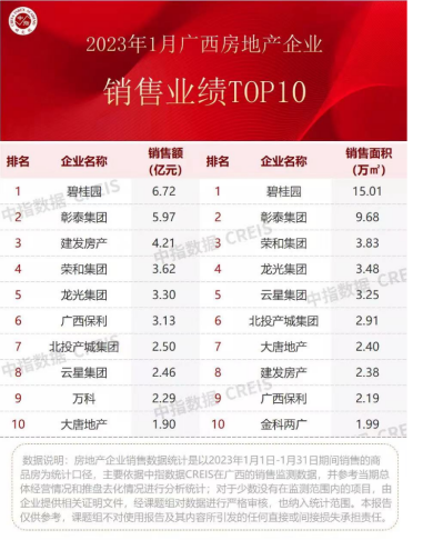 而據中指研究院統(tǒng)計數(shù)據顯示,廣西房地產企業(yè)今年1月份的銷售業(yè)績榜單前十成員,成交數(shù)據普遍好于去年同期,成交金額最低也有1.9億元,最高為排名榜首的碧桂園,總銷售額達到6.72億元,迎來了兔年樓市“開門紅”。
