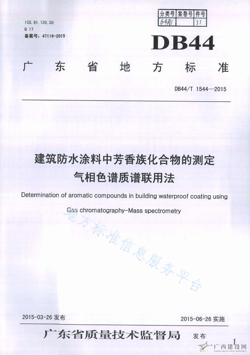 DB44 T 1544-2015建筑防水涂料中芳香族化合物的測定 氣相色譜質譜聯用法
