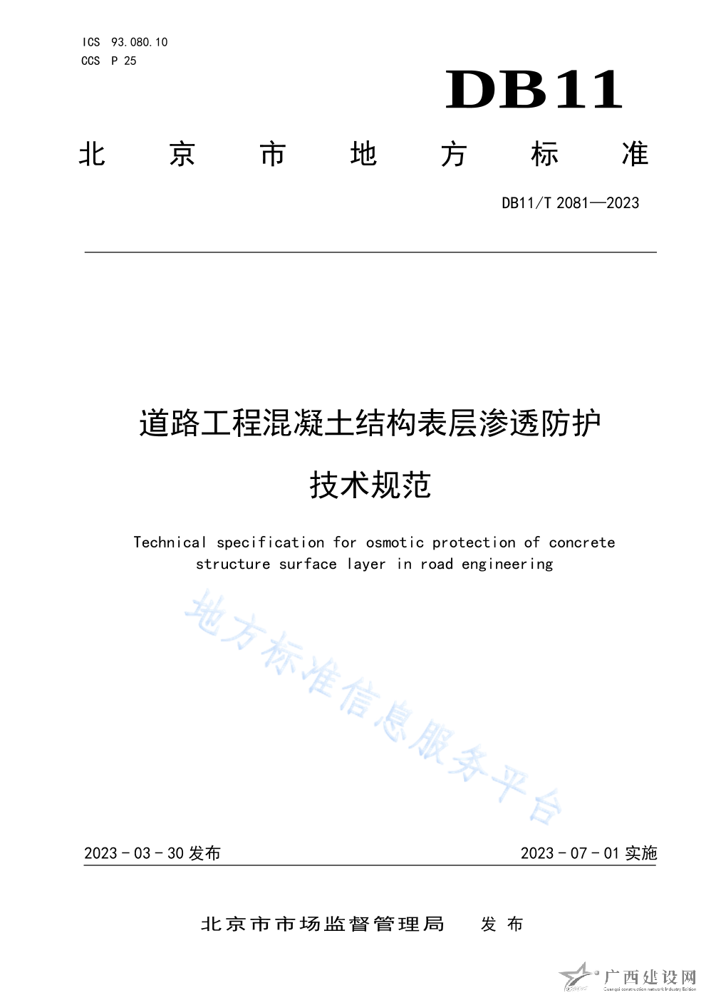 DB11!T+2081-2023道路工程混凝土結(jié)構(gòu)表層滲透防護(hù)技術(shù)規(guī)范(北京市市場監(jiān)督管理局)