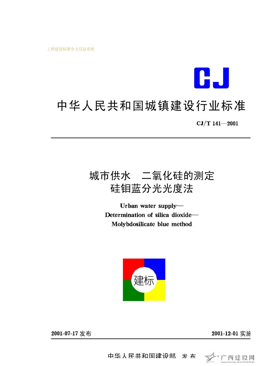 城市供水 二氧化硅的測定硅鉬藍分光光度法 CJ/T141—2001