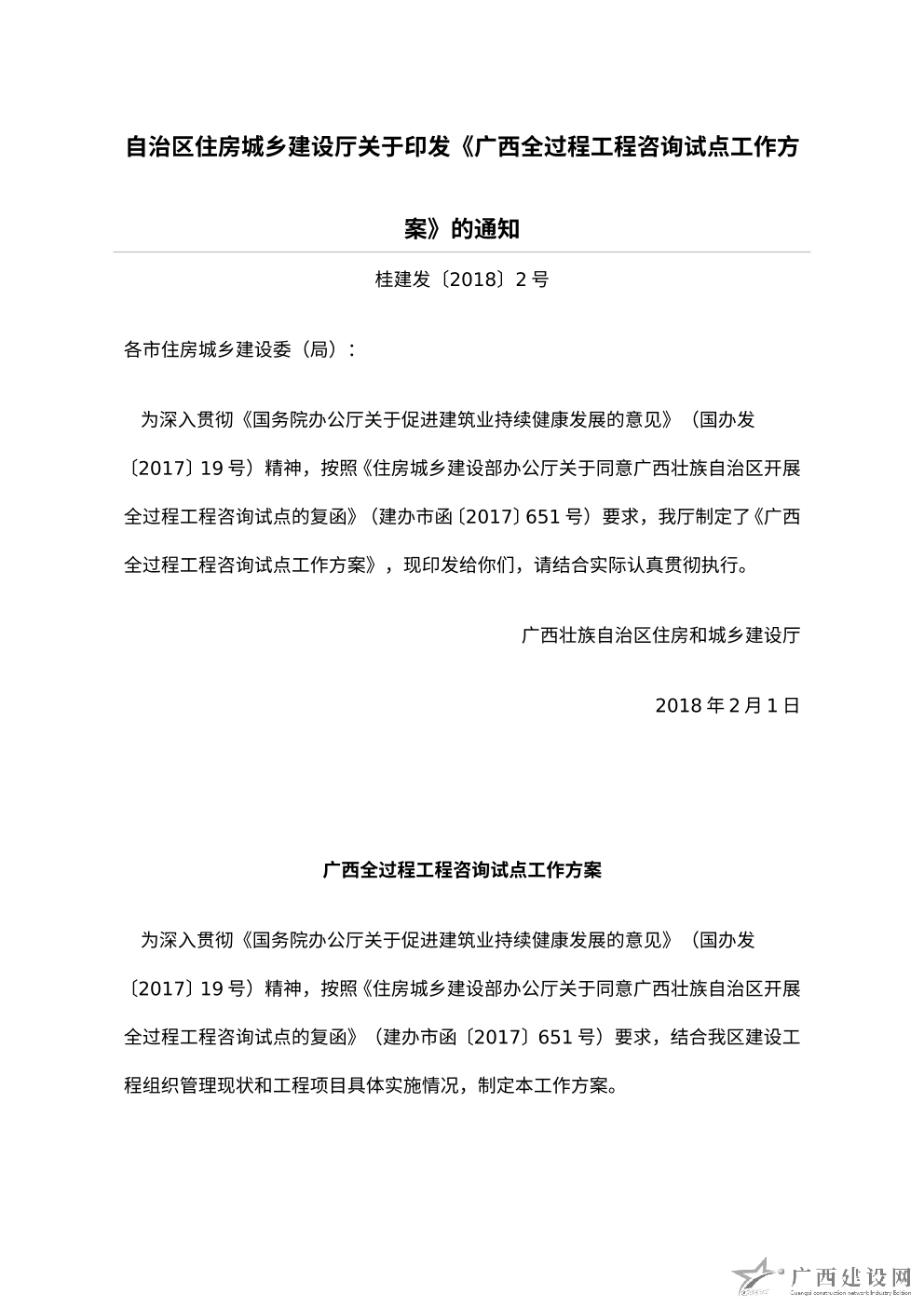 桂建發(fā)〔2018〕2號(hào)自治區(qū)住房城鄉(xiāng)建設(shè)廳關(guān)于印發(fā)《廣西全過(guò)程工程咨詢(xún)?cè)圏c(diǎn)工作方案》的通知