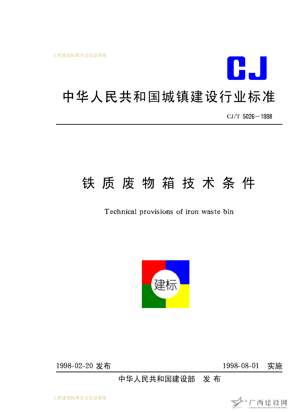 鐵質(zhì)廢物箱技術(shù)條件 CJ/T5026-1998