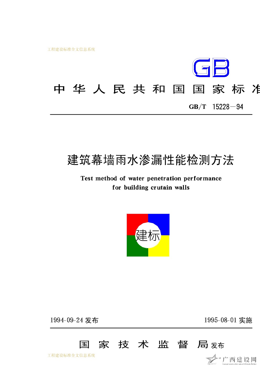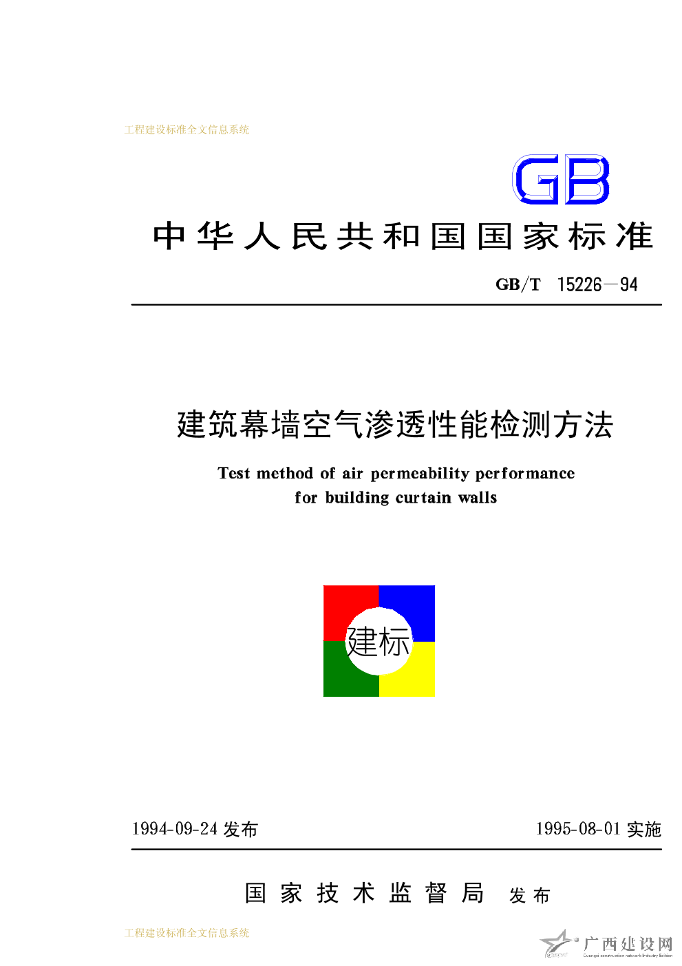 建筑幕墻空氣滲透性能檢測方法 GB/T15226-94