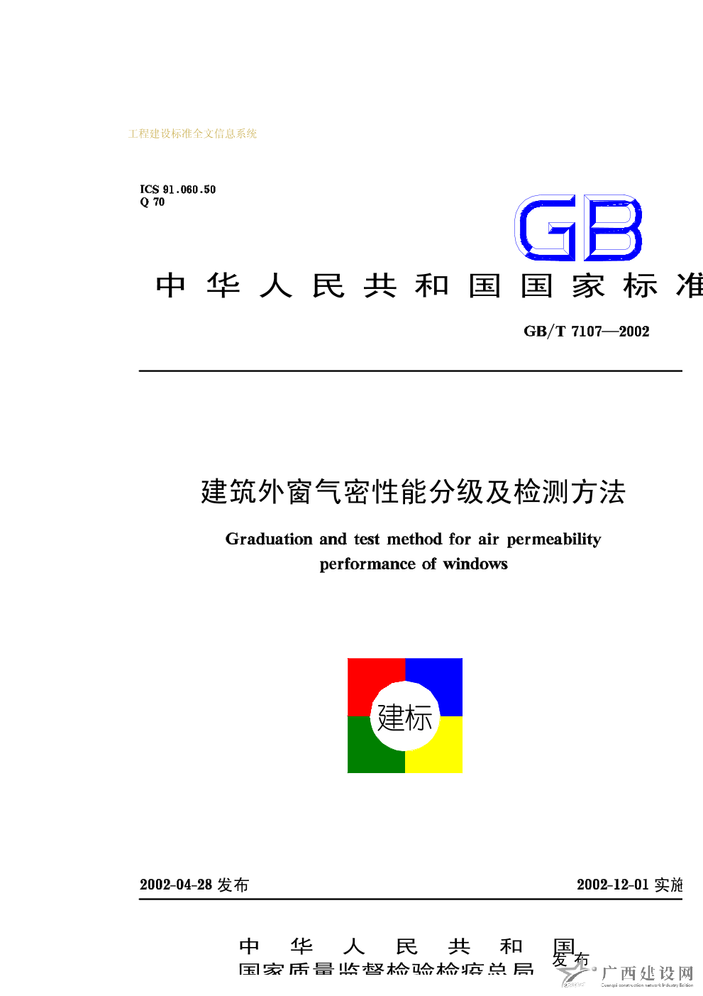 建筑外窗氣密性能分級及檢測方法 GB/T7107—2002