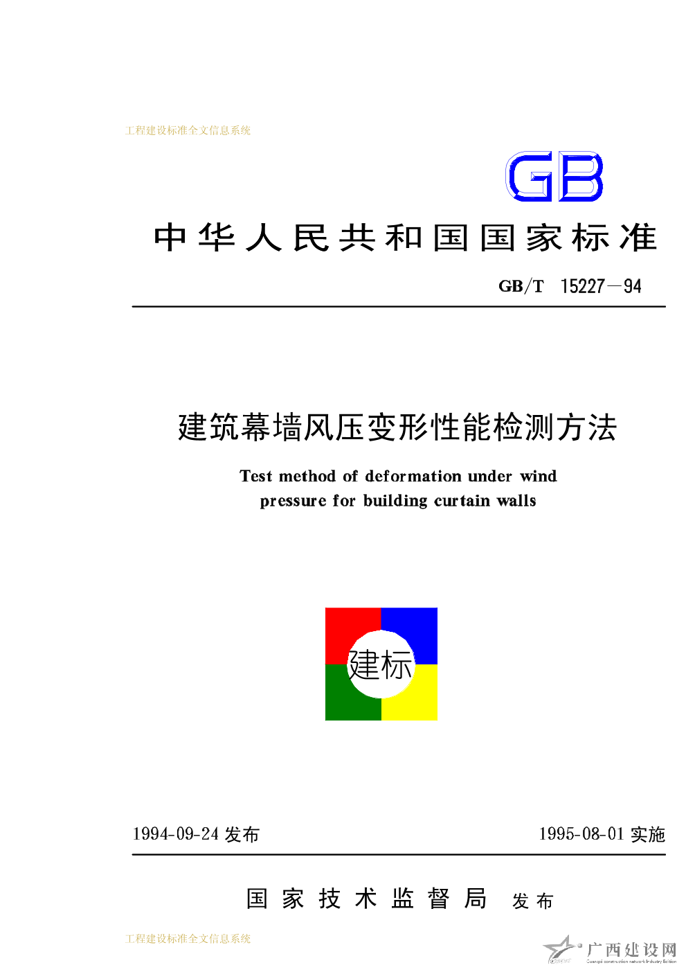 建筑幕墻風壓變形性能檢測方法 GB/T15227-94