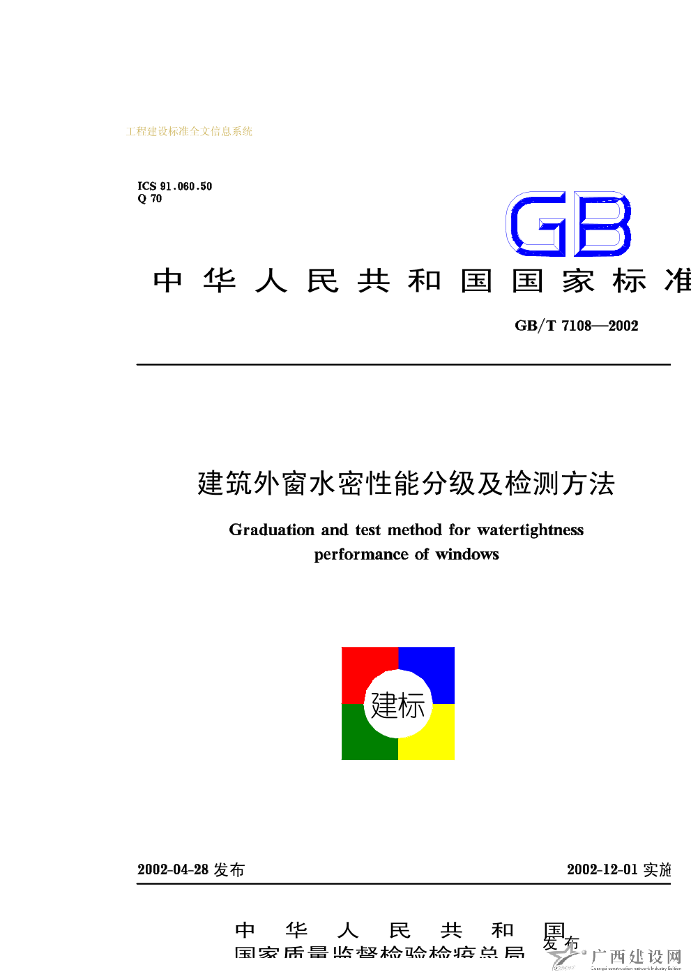 建筑外窗水密性能分級及檢測方法 GB/T7108—2002
